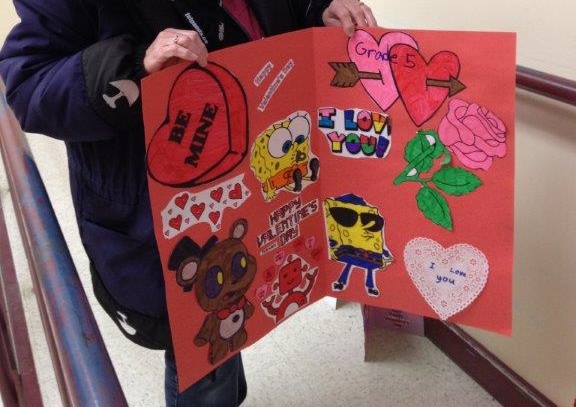 (Photo: Kim Tabor presents the winning Valentines day card design at Red Sucker Lake School)