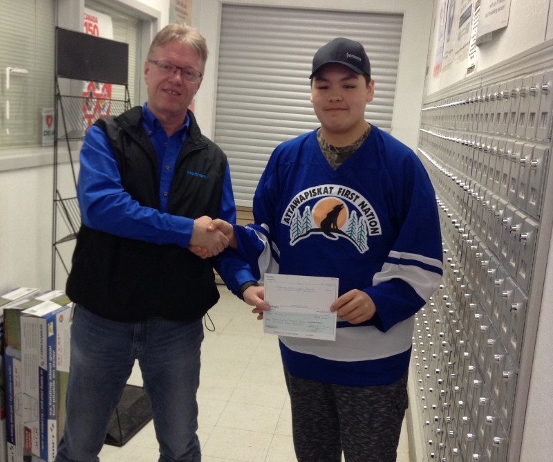 Gerald Landry, the Attawapiskat Northern Store manager, presented a donation of $2,000 to Jarrette Paul Martin, the captain of The Attawapiskat Midget Selects, on Feb. 22.