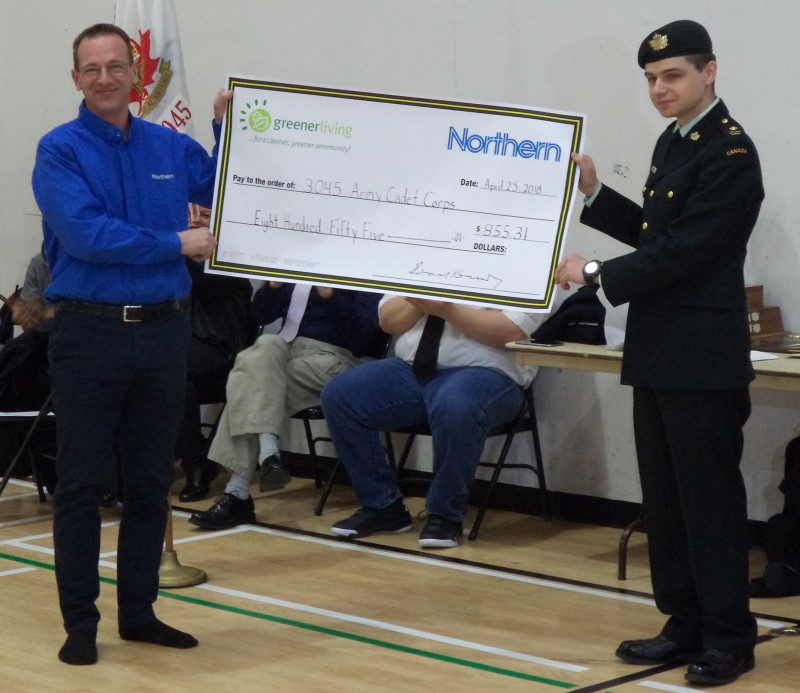 John MacKenzie, the Northern store manager in Arctic Bay, was pleased to present a cheque for $855.31 to the Cadets, as a Greener Tomorrow grant.