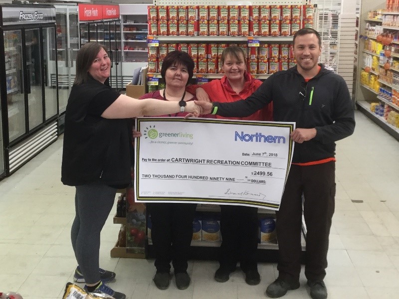 (Photo: Left to right: Jennifer McCrone, Cartwright Northern Store Manager; Patricia Williams Learning, Northern Store Admin Supervisor; Mel Pardy, Cartwright Recreation Committee Treasurer; and Preston Morris, President of the Cartwright Recreation Committee.)