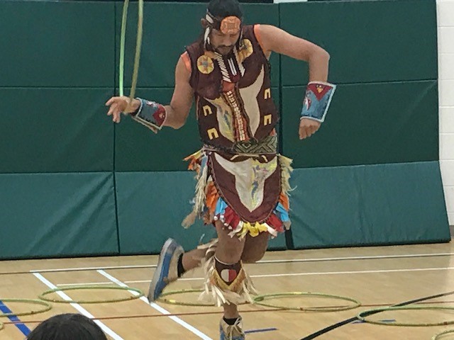 (Photo: Dallas Arcand, 3 time World Champion hoop dancer performs at Indian Horse screening event)